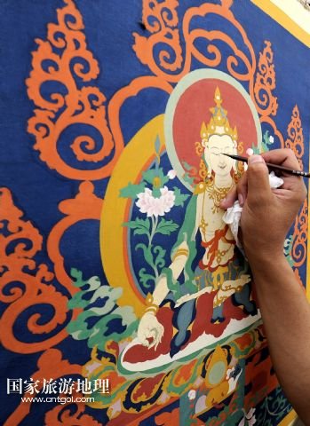 國家旅游地理 西藏拉薩8月4日訊 8月3日,一名畫師在現(xiàn)場演示唐卡繪制過程。當(dāng)日,第三屆西藏“唐卡藝術(shù)博覽會”在拉薩羅布林卡舉行,共展出89名優(yōu)秀畫師的230多幅精品力作。唐卡作為藏族特有的繪畫,有上千年的歷史,已成為藏族文化的“名片”,受到國內(nèi)外廣泛關(guān)注。 /新華社記者 覺果 攝