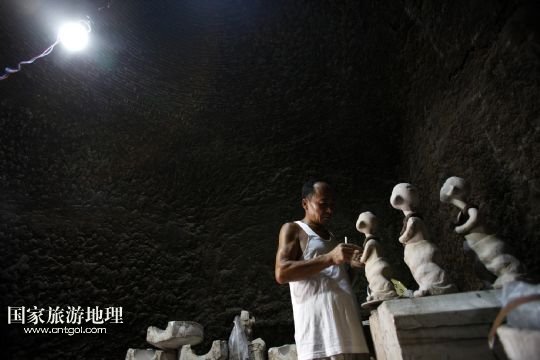 8月5日,山東省淄博市博山區(qū)一名民間藝人在“饅頭窯”里制作陶瓷藝術(shù)品。