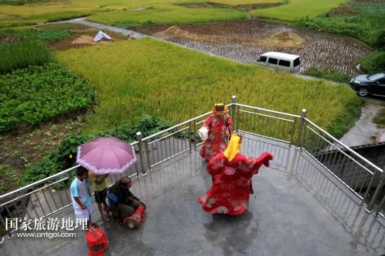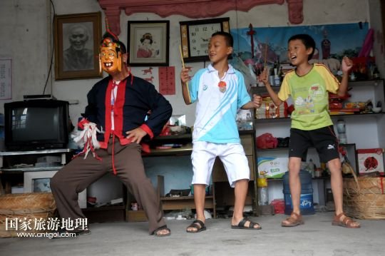 國(guó)家旅游地理 廣西河池8月19日訊 8月18日,譚圣慈老人(左一)帶著前來(lái)學(xué)習(xí)的兩名男孩跳儺面舞。在廣西北部與貴州交界一帶的我國(guó)唯一的毛南族自治縣——環(huán)江毛南族自治縣,神秘的儺戲被譽(yù)為毛南族的“族寶”。原始古樸、風(fēng)格獨(dú)特的儺戲是毛南族的民間傳統(tǒng)舞蹈,藝人在表演過程中經(jīng)常戴著被稱為儺面的木制面具。儺面一般高30厘米、寬20厘米,由毛南族藝人在民族口頭文學(xué)的基礎(chǔ)上依據(jù)個(gè)人想象創(chuàng)作,用優(yōu)質(zhì)木塊雕琢而成,共有文、武、善、兇四大類72種面相。