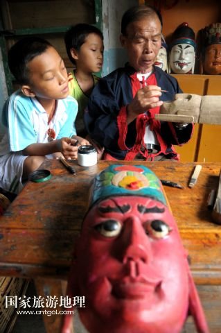 譚圣慈老人今年72歲,從22歲開始學(xué)雕刻儺戲面具,迄今,已經(jīng)堅(jiān)持了50年。老人說,他制作的面具因工藝精湛,造型優(yōu)美,曾吸引遠(yuǎn)方的客人高價(jià)購(gòu)買。但是,卻少有人來(lái)學(xué)習(xí)面具的雕刻與制作。儺戲于2006年被列入非物質(zhì)文化遺產(chǎn)名錄之后,政府加大了保護(hù)力度,但因?yàn)槊婢叩闹谱髦芷陂L(zhǎng)、工序復(fù)雜,銷售渠道少等原因,仍無(wú)法吸引年輕人學(xué)習(xí)雕刻的興趣。為了收到心儀的徒弟,傳承這獨(dú)到的技藝,他到處發(fā)布免費(fèi)收學(xué)徒的信息。在他的堅(jiān)持下,今年暑期,鄉(xiāng)里有兩名對(duì)面具制作感興趣的男孩來(lái)到譚圣慈身邊學(xué)藝。老人高興地說:“我給他們講很多故事,就是希望他們能對(duì)此提起興趣,愛上木面雕刻,別讓這老手藝失傳了。” /新華社發(fā)