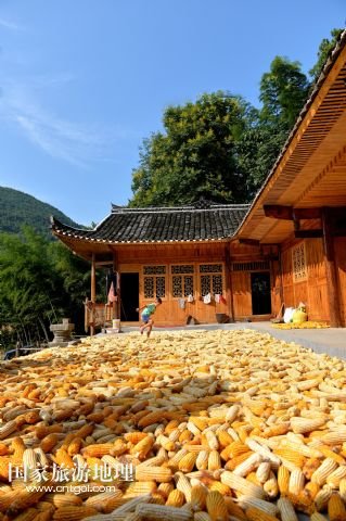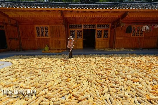 國(guó)家旅游地理 湖北恩施8月22日訊 8月22日,湖北省宣恩縣水田壩村二組農(nóng)民侯慶云在吊腳樓前晾曬玉米。初秋時(shí)節(jié),湖北省恩施土家族苗族自治州宣恩縣農(nóng)民搶抓時(shí)節(jié),對(duì)玉米等農(nóng)作物進(jìn)行收獲晾曬,山鄉(xiāng)家家戶戶忙“曬秋”,到處是一派豐收景象。 /新華社發(fā)(宋文 攝)