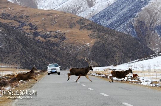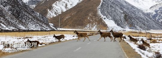 西藏工布江達縣境內(nèi) 白唇鹿群過公路(圖)