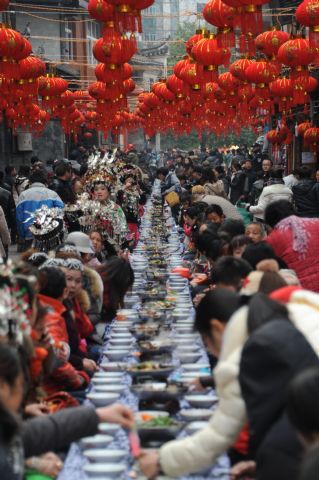 2月14日,湖南鳳凰景區(qū)擺起近百米長(zhǎng)的苗家長(zhǎng)龍宴,當(dāng)?shù)鼐用窈陀慰凸矐c元宵佳節(jié)。