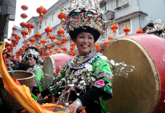 國(guó)家旅游地理 湖南湘西2月15日訊 2月14日,湖南鳳凰苗族婦女打起苗鼓。當(dāng)日是農(nóng)歷元宵節(jié),在湖南鳳凰古鎮(zhèn),當(dāng)?shù)鼐用衽c游客歡聚一堂,共同參與各種民俗文化表演活動(dòng),慶祝節(jié)日。 /新華社記者 范軍威 攝