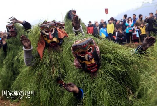 國家旅游地理 廣西柳州2月20日訊 2月16日,一名苗族青年戴著面具、披著芒草,扮成 “芒哥”跳舞。當日是農(nóng)歷正月十七,地處深山的廣西柳州市融水苗族自治縣安陲鄉(xiāng)在江門苗寨舉行傳統(tǒng)的“芒哥節(jié)”。眾多苗族男性青少年戴著面具、披著芒草、扮成“芒哥”起舞,為人們驅(qū)邪避禍,送去新春的祝福。據(jù)介紹,演“芒哥”是當?shù)孛缂胰霜毦咛厣男麓簜鹘y(tǒng)活動之一。 /新華社發(fā)(龍濤 攝)