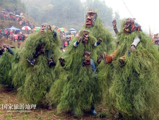 摘要:農(nóng)歷正月十七,地處深山的廣西柳州市融水苗族自治縣安陲鄉(xiāng)在江門苗寨舉行傳統(tǒng)的“芒哥節(jié)”。眾多苗族男性青少年戴著面具、披著芒草、扮成“芒哥”起舞,為人們驅(qū)邪避禍,送去新春的祝福。據(jù)介紹,演“芒哥”是當?shù)孛缂胰霜毦咛厣男麓簜鹘y(tǒng)活動之一。