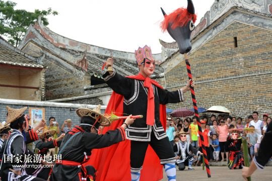國家旅游地理 廣東云浮6月14日訊 6月13日,在廣東省郁南縣蘭寨古村,郁南縣民間藝人在表演國家級非遺郁南禾樓舞。